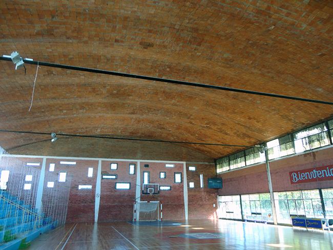Gimnasio Polideportivo. Bóvedas de doble curvatura con lucernario. Área cubierta 650 m2. Maldonado 2128, Montevideo.