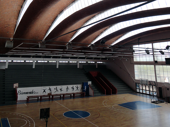 Gimnasio Polideportivo. Bóvedas de doble curvatura con lucernario. Área cubierta 650 m2. Maldonado 2128, Montevideo.