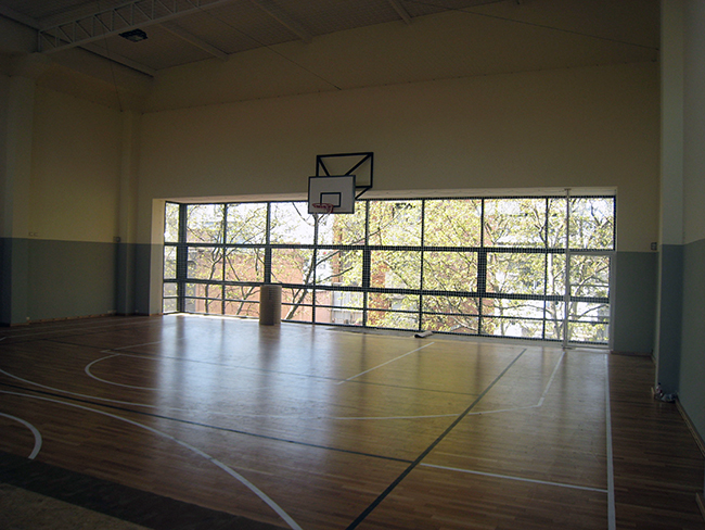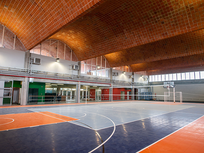 Gimnasio. Bóvedas de doble curvatura con lucernarios. Área cubierta 800m2. 8 de Octubre 2977, Montevideo.