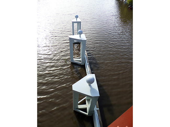 elementos metálicos y de madera colocados sobre los pilotes forman guías para protección de las pilas del puente